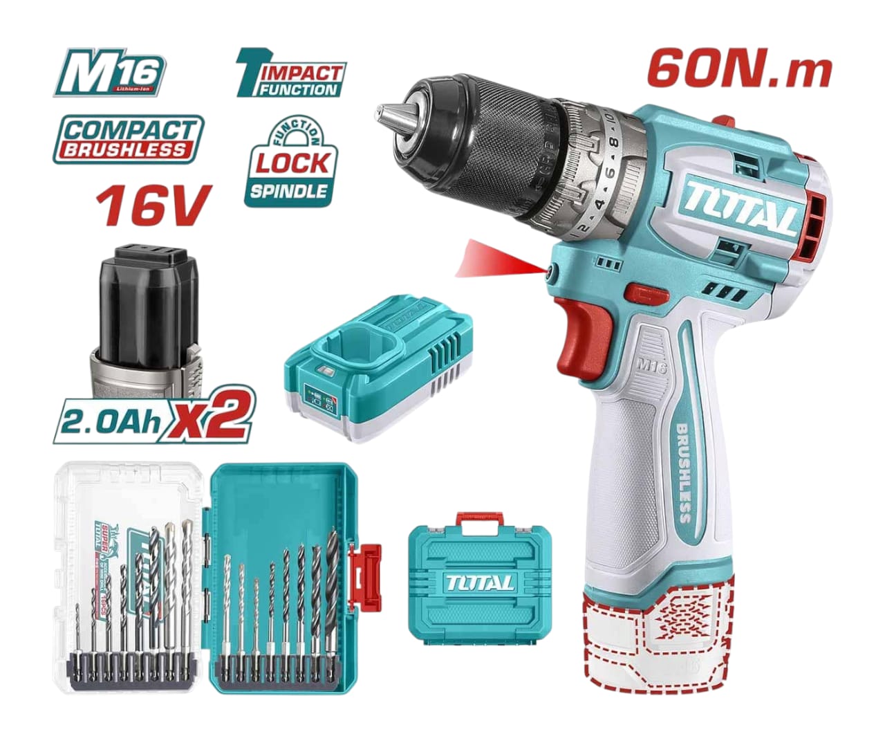 صغير في الحجم… كبير في الأداء! شنيور Total TOSLI241199 بجهد 16 فولت وعزم 60 نيوتن، يجمع بين قوة الطرق (30000 ضربة/دقيقة) وسرعة دوران عالية (2000 لفة/دقيقة)، وهيكل مريح بموتور براشليس لضمان المتانة والكفاءة. مزوّد بظرف معدني 13 مم، 22+1+1 إعداد عزم، وبطاريتين 16 فولت + شاحن.