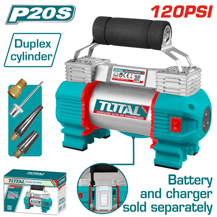 ? انطلق بثقة مع منفاخ توتال اللاسلكي 20 فولت – قوة “البستم الثنائي” في قبضة يدك!هل تعبت من البحث عن محطات الوقود لنفخ إطارات سيارتك؟ أو من الأسلاك الطويلة والمعقدة للمنافيخ التقليدية؟نقدم لك منفاخ الهواء اللاسلكي TOTAL (موديل TACLI2026)، الحل الأمثل والأسرع لحالات الطوارئ والرحلات. يتميز هذا الوحش الصغير بنظام “Duplex Cylinder” (بستم ثنائي) الذي يمنحك سرعة نفخ مضاعفة وقوة هواء تصل إلى 120 PSI، مما يجعله قادراً على التعامل مع إطارات السيارات، الدراجات، وحتى الكرات والمراتب الهوائية في ثوانٍ معدودة.? لماذا تختار منفاخ توتال P20S؟