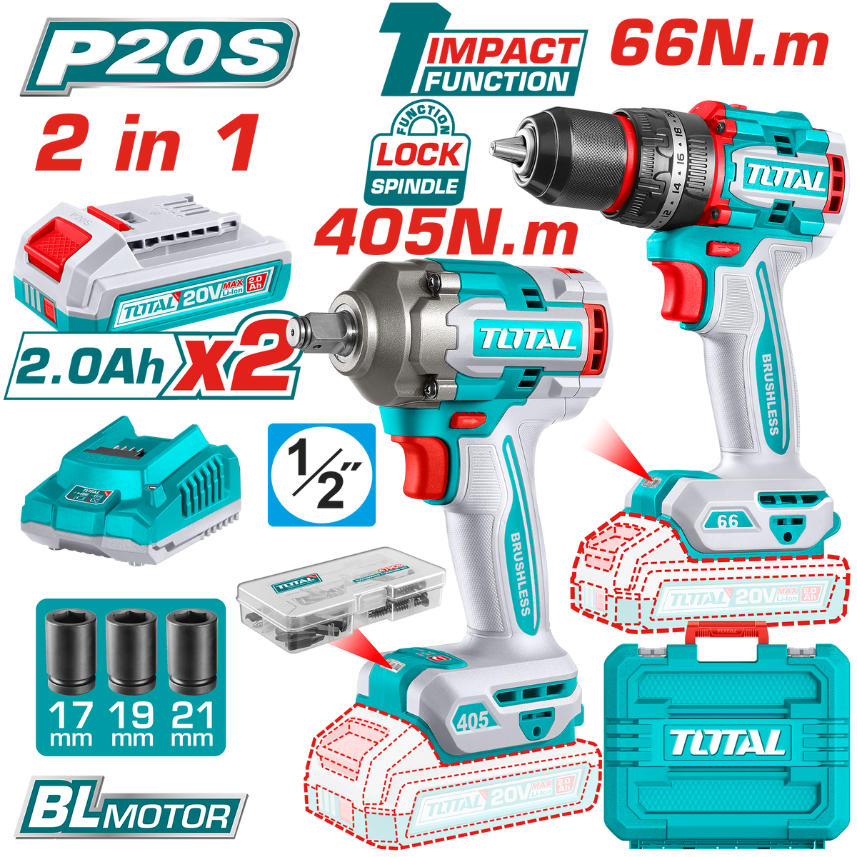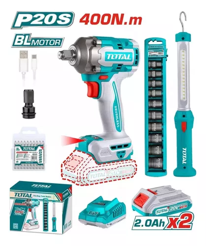 - دريل فك وربط لاسلكي (Impact Wrench): موديل TIWLI20451، بفتحة “1/2 بوصة وعزم ربط يصل إلى 405 نيوتن متر (وعزم فك يصل لـ 555 نيوتن متر).