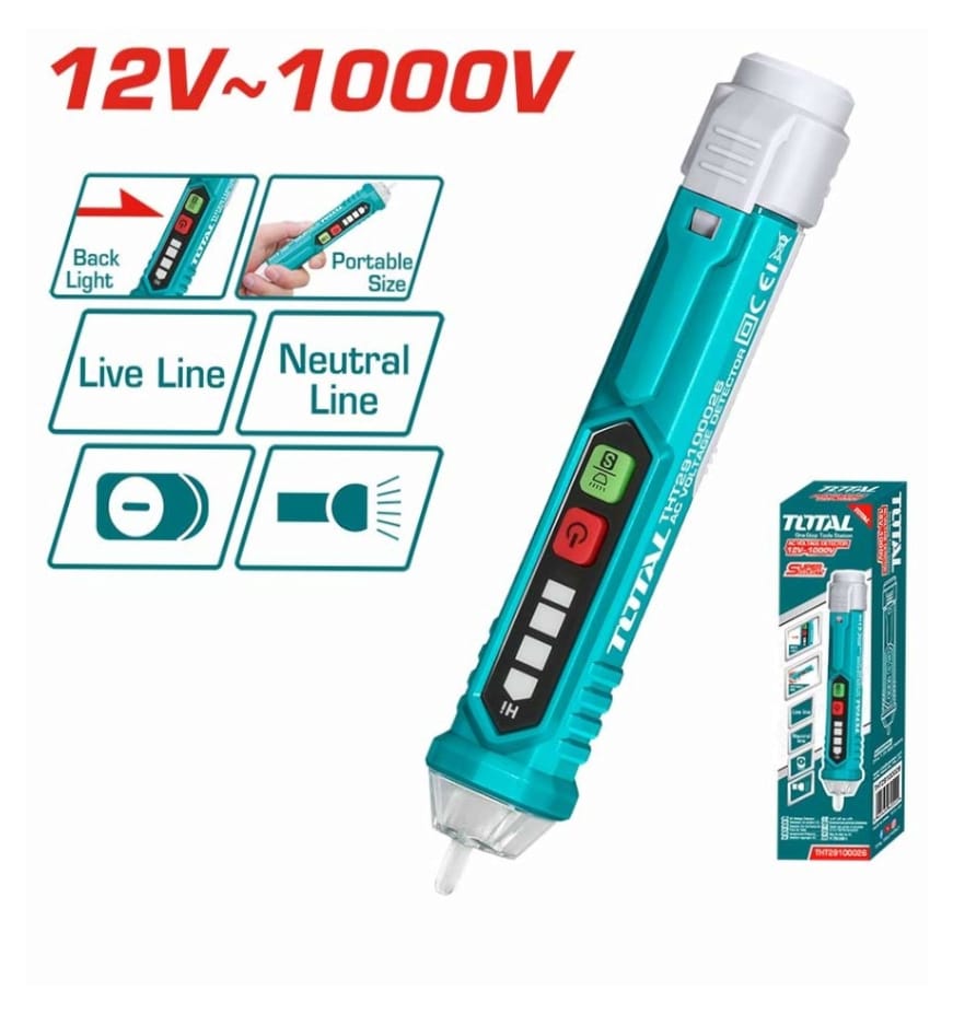 مفك تست حساس عالي الدقة، يكشف عن التيار المتردد بجهد من 12 حتى 1000 فولت، مزوّد بإنذار صوتي وضوئي، ضوء LED أبيض، خاصية الإيقاف التلقائي، وتمييز الخط المباشر. مثالي للفنيين وأعمال الصيانة اليومية.